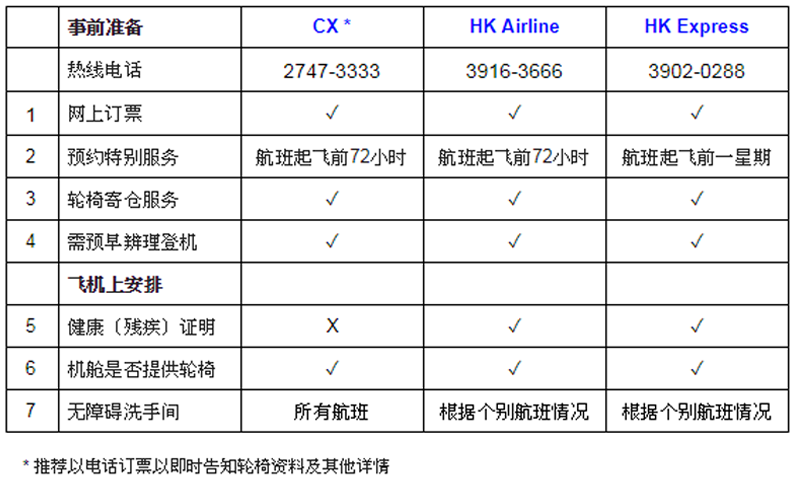 相比以网上方式订机票,国泰及港龙航空更加推荐以电话订票去即时告知有特殊服务需要;如果直接在网上订票有可能会造成购买了的航班不能提供适合的轮椅托运服务而需要改班次的情况。客人可要求特殊服务包括: