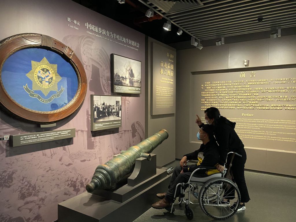 母亲推著轮椅带儿子参观,不错过一块展板