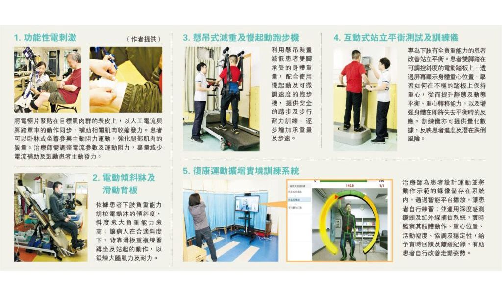 现在康复科技发展一日千里,物理治疗辅助器材日新月异,能在不同复康阶段提供针对训练。即使患者未有足够的承重能力,亦可在卧牀、坐轮椅上、减重站立下,安全地接受密集式训练,即使在早期阶段亦可打好走路的基础能力。
