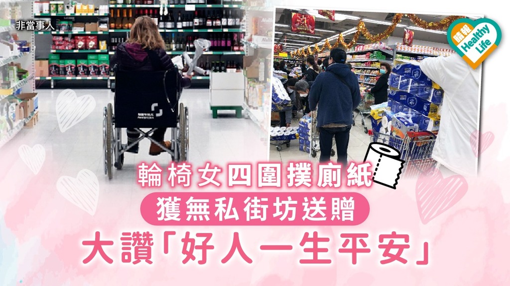 - [晴報]武汉肺炎疫情愈趋严重,香港日前因一则谣传信息,令不少市民盲抢食米以至厕纸等日用品,但在抢购潮下却发生一件好人好事,有行动不便需坐轮椅的女网民在超市门前遇到一位好街坊,对方几经辛苦买到两条厕纸,竟主动将其中一条免费转赠予她,让她大为感动。......