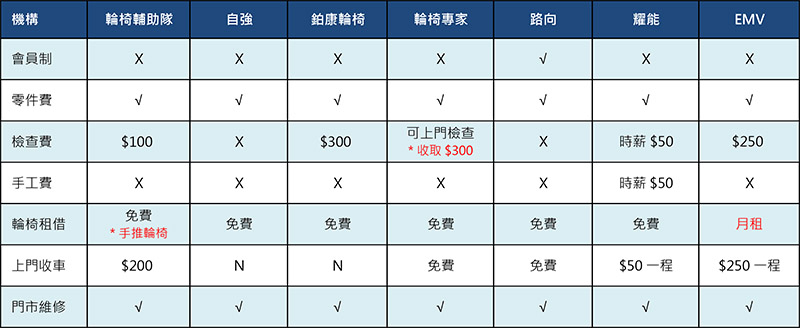 收费:自强及路向的收费是最廉宜,因为只需支付零件费,不需支付检查费等费用,不过路向只为会员服务,其次是香港轮椅辅助队,检查费只需要$70。