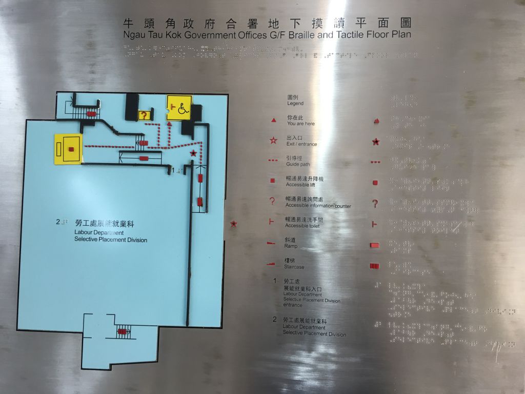 The ground floor of the Ngau Tau Kok Government Offices is the Kowloon District Office of the Selective Employment Division of the Hong Kong Labour Department. People with wheelchairs/handicapped can go there alone.