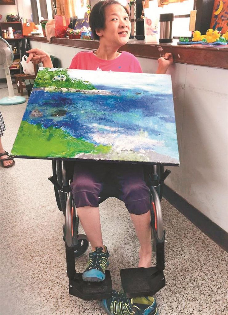 - [人間福報]高雄市腦性麻痺服務協會的繪畫班,學畫的學員坐在長桌上準備畫畫,今年三十七歲的靜宜坐在靠窗邊的輪椅上,左腳的鞋子脫掉,「穿上」工作用棉布手套,她就用左腳畫畫。......