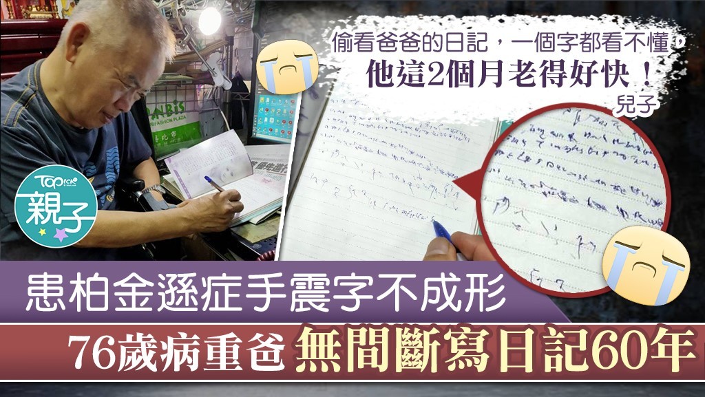 - [topick.hket]要珍惜跟家人共處的時刻。台灣有名網民分享患有柏金遜症爸爸的故事,76歲的爸爸有寫日記的習慣,可是由於病情嚴重,手抖震得愈來愈難寫字,兒子看見爸爸的情況,百感交集。他分享所感,感動了很多人。......