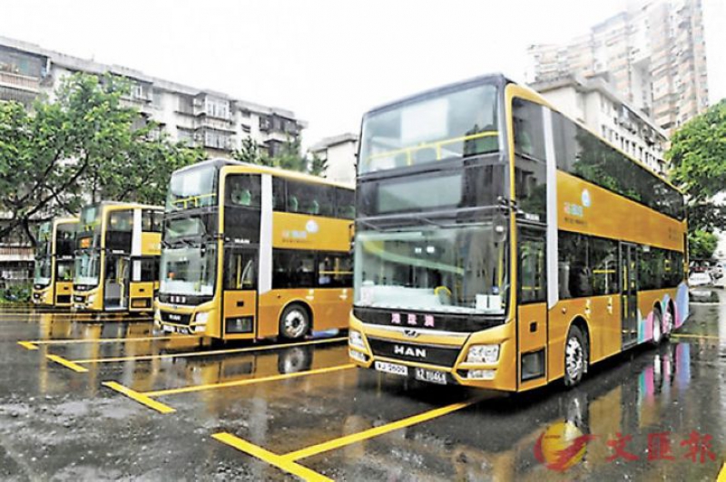 前日,在廣東港珠澳大橋穿梭巴士有限公司珠海基地停車場,十餘輛雙層、單層的金色大巴整齊停放,金光閃閃。
