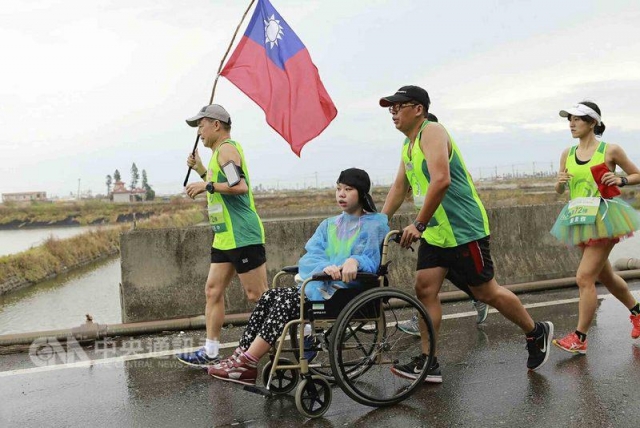 住在雲林的單親爸爸李孟晉推著坐輪椅的腦性麻痺女兒,接力第七十二棒路跑10公里,爸爸雙手推著輪椅邁步向前,女兒一路上不時揮手並高喊「衝啊」,畫面令人感動。