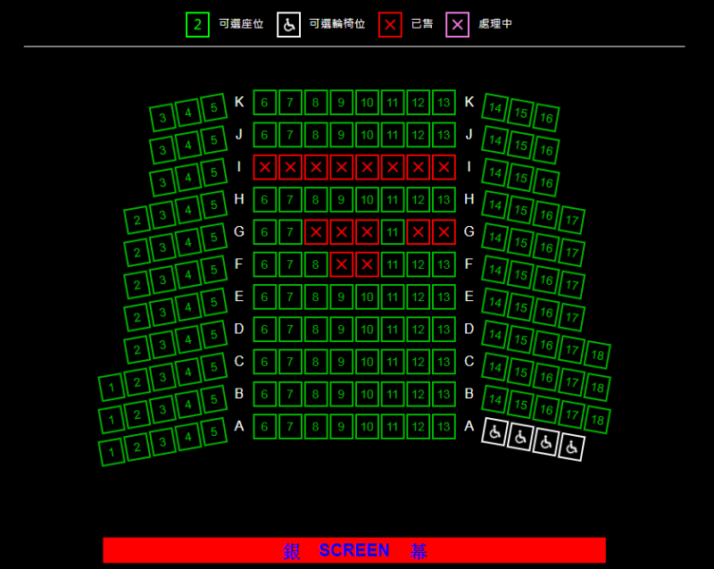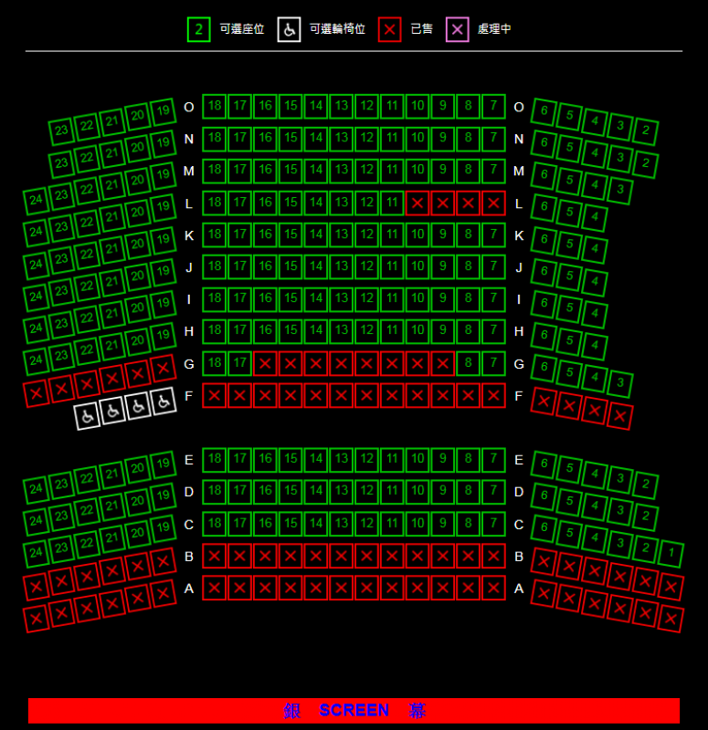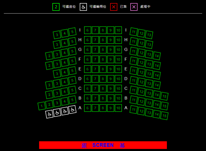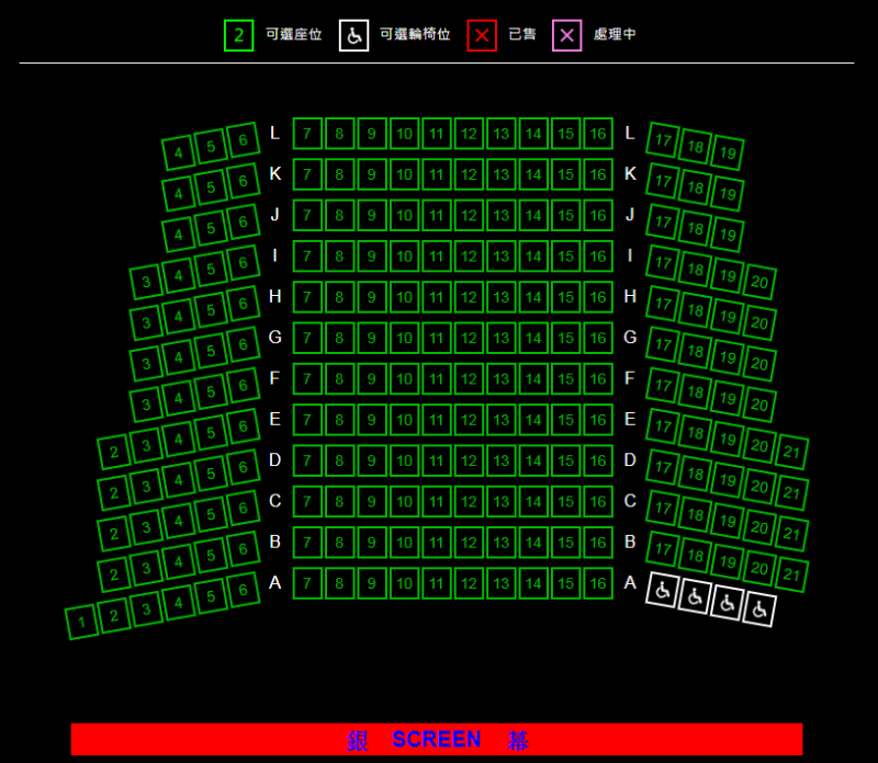 只有1號影院的輪椅位在中排,2至4號影院的輪椅位在最前排,並均設有4個輪椅位,輪椅人士購票前需注意