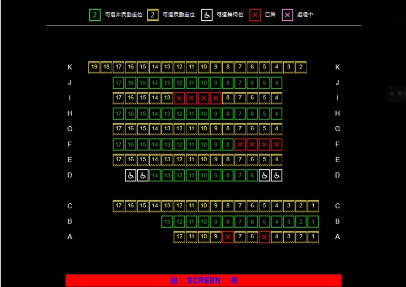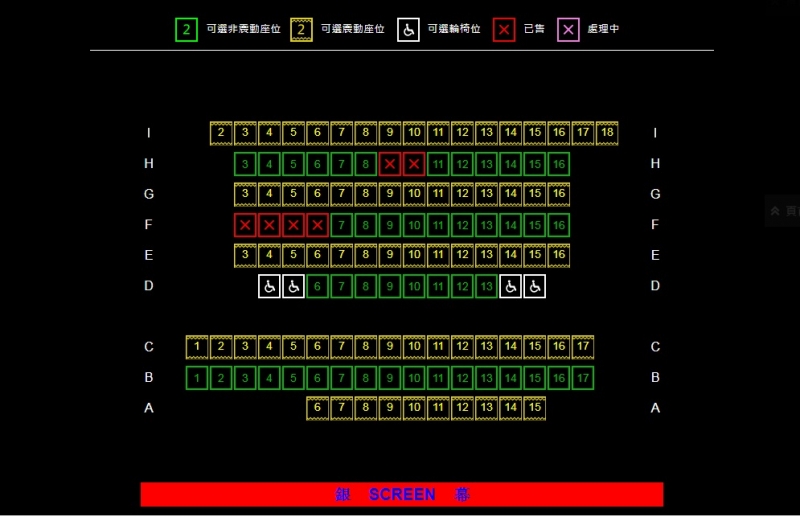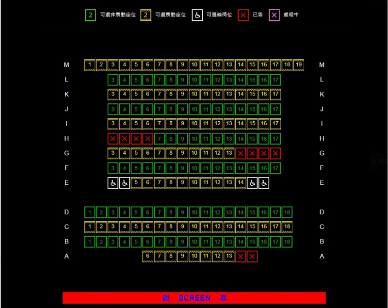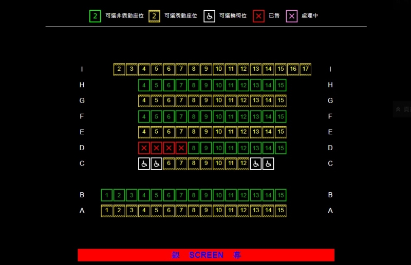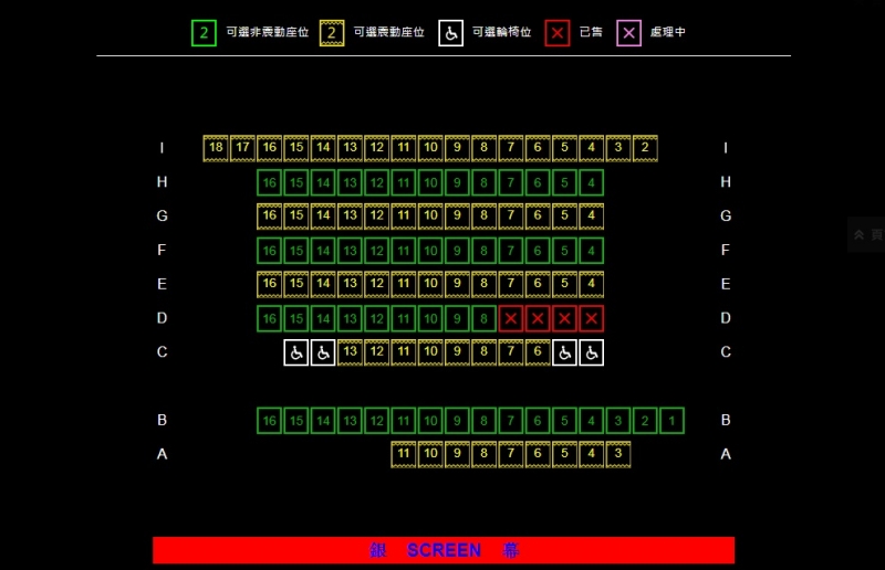 全部(1號至5號)影院的輪椅位在中排,並均設有4個輪椅位,輪椅人士購票前需注意