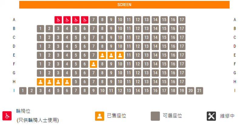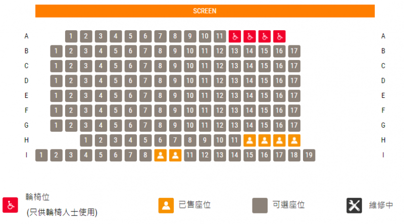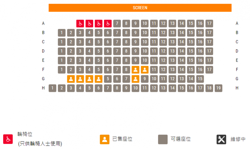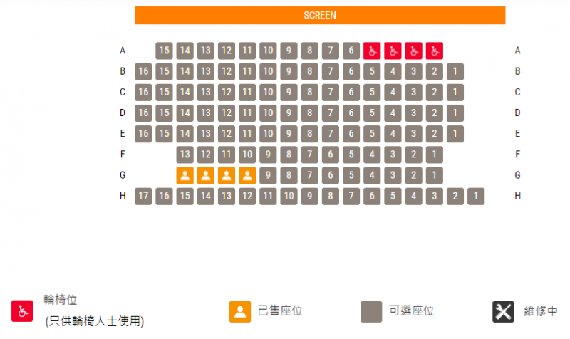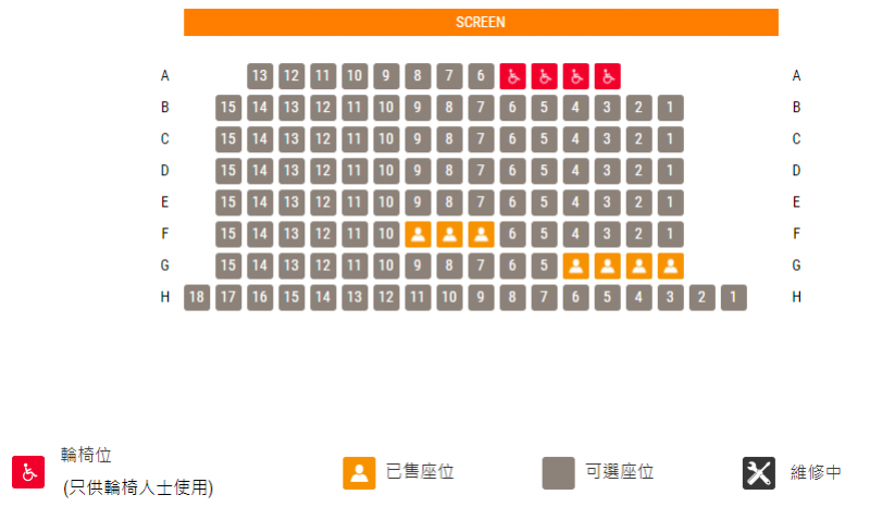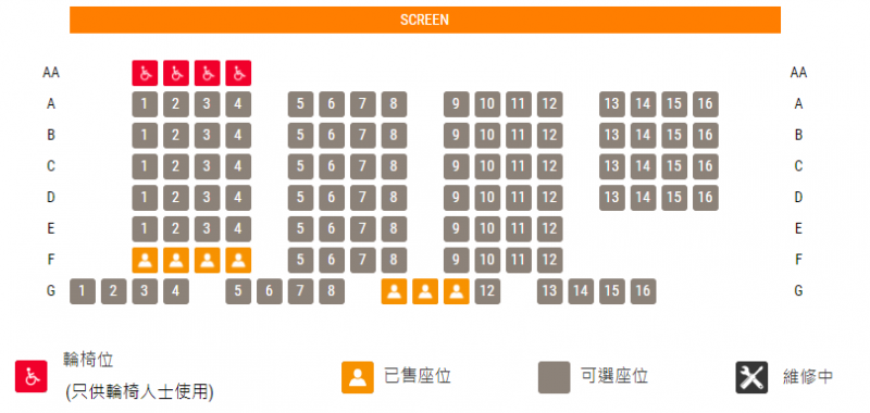 全部(1至6號)影院的輪椅位均在最前排,並均設有4個輪椅位,輪椅人士購票前需特別注意