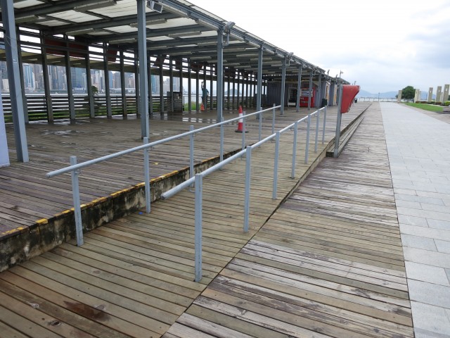 港鐵D4或D5出口,乘升降機上天橋往西九方向電乘升降機落便到達,長廊內道路平坦,部份地方設有斜道。